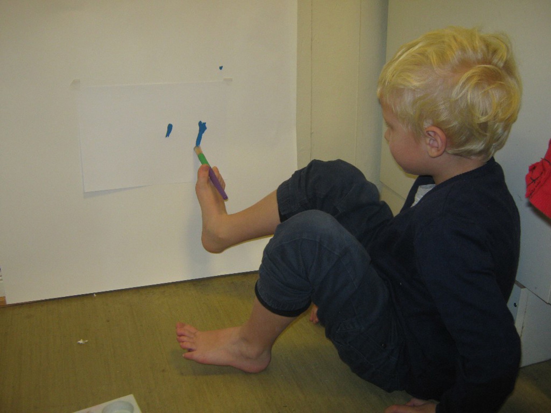 Å holde malepenselen med tærne var ikke så lett, men etter litt øving gikk det bedre og bedre. De malte med tærne og føttene rett på papir uten pensel. En rar følelse med gladd og litt kald maling under føttene.